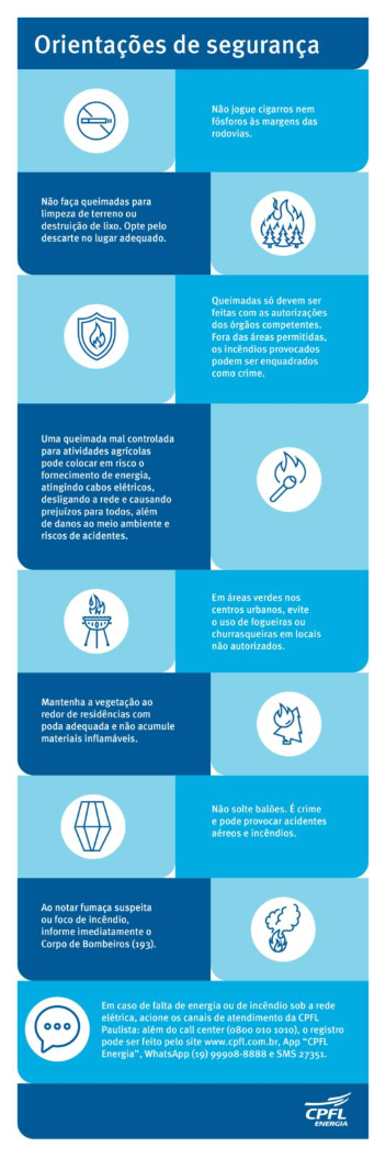 Os riscos de queimadas próximas às linhas de transmissão ou distribuição de energia norteiam as medidas, afirma Rafael Lazzaretti, diretor-presidente da CPFL Piratininga, pelo potencial de comprometer o serviço aos clientes. “Devido à interligação do sistema elétrico, incêndios em uma região podem afetar uma vasta área, interrompendo o fornecimento de energia para cidades inteiras e causando transtornos significativos”, observa.