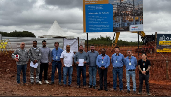 Fábio Ojea Nascimento, gerente de Operações de Subtransmissão, Genivaldo de Jesus Nunes, consultor de relacionamento, e demais representantes da CPFL Paulista, recebem Fábio Santos e Wagner Antonio Bragalda, prefeito e vice-prefeito de Rafard, e Nivaldo Aparecido Lourenço, presidente da Câmara Municipal, no local da futura subestação (Foto: Divulgação/CPFL)